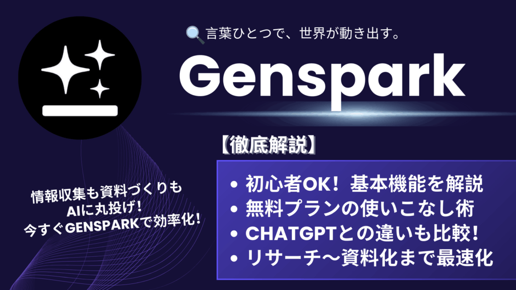 本記事では、Gensparkの基本的な特徴から登録方法、具体的な活用例、料金プラン、他のAIツールとの比較まで詳しく解説します。Gensparkを効果的に活用して、情報収集の効率を劇的に向上させましょう。