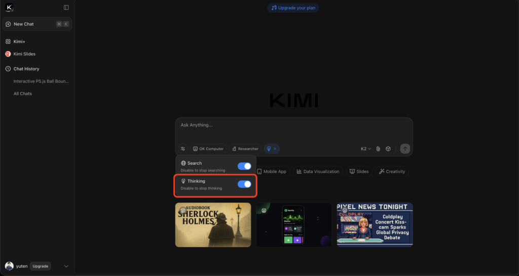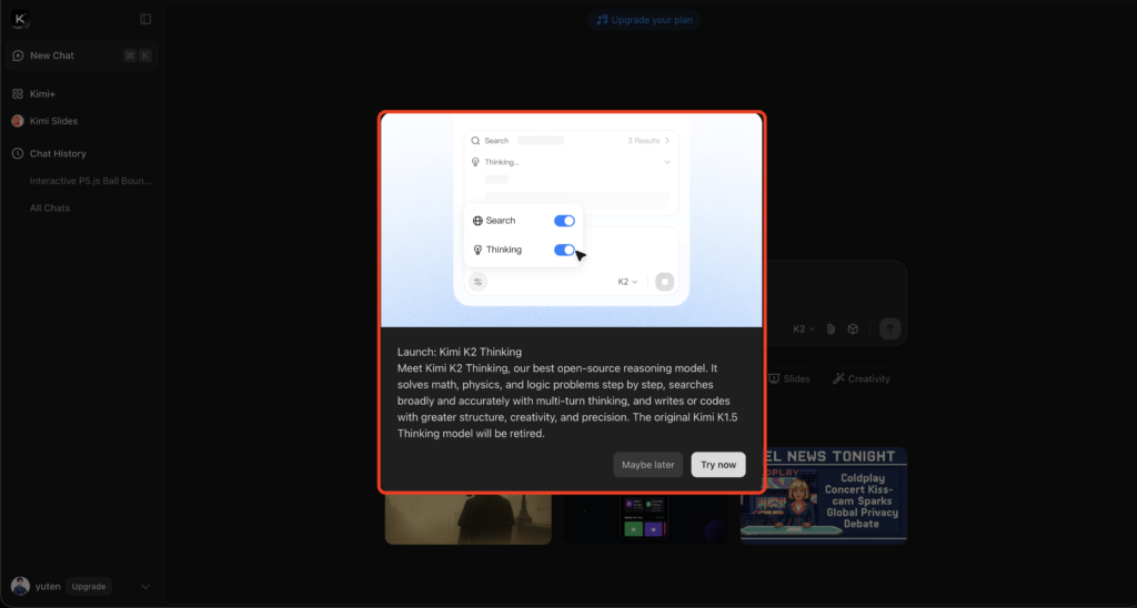 シンプルにK2 Thinkingを試すには、Moonshot AIが提供する公式チャットサービス「Kimi」を利用する方法があります。