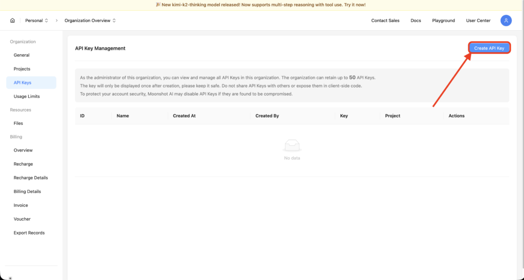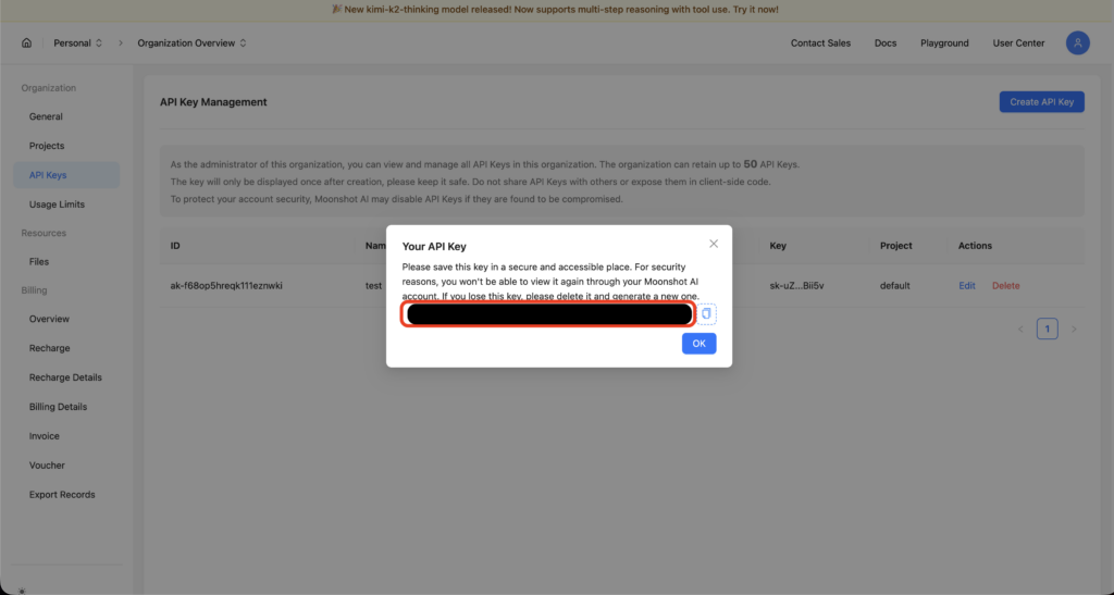 まず、Moonshotのプラットフォームサイト(platform.moonshot.ai)上で開発者登録を行い、APIキーを発行します。
