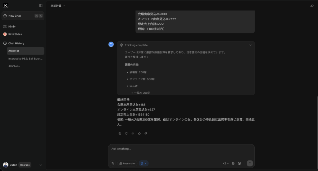 Kimi K2では、リリース当初「思考モード(Thought-mode)は未対応」だったため、モデル内部の推論過程をユーザーが直接見ることはできませんでした。