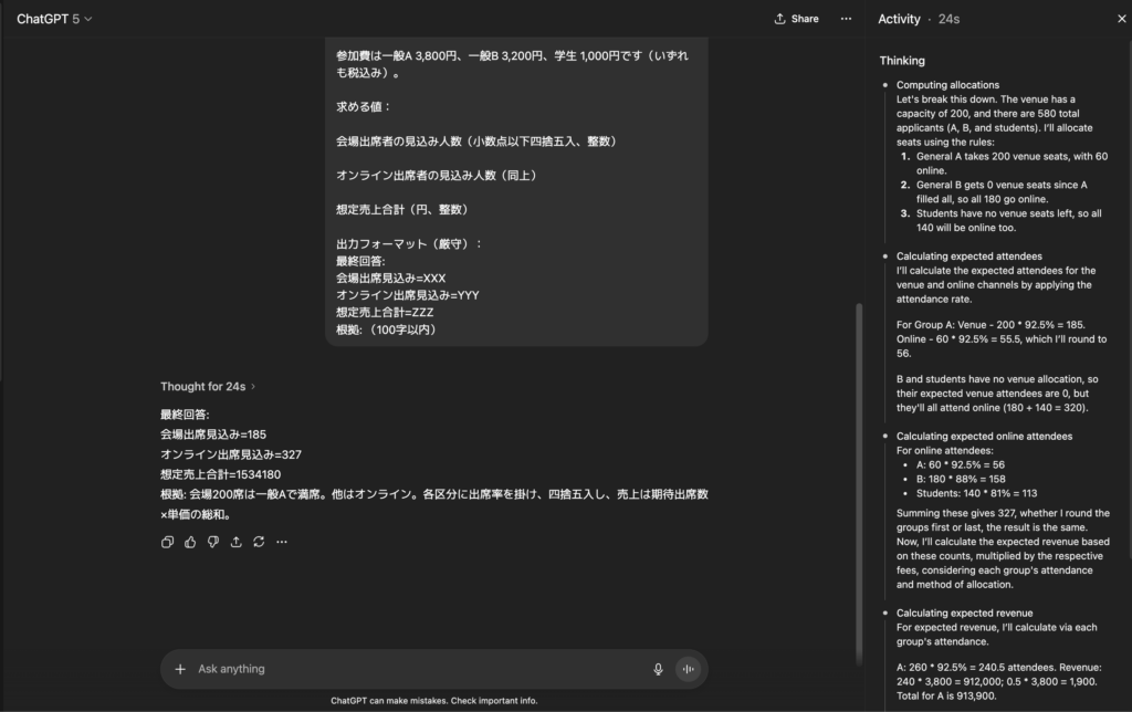 それでは実際にKimi K2 Thinkingの性能を確認するべく、GPT-5と比較検証していきましょう。数理タスクとコーディングタスクの2つで両モデルのアウトプットを比較します。