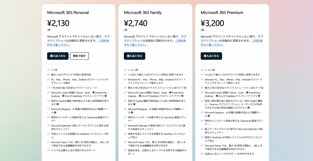 Microsoft 365 Premiumの料金は、月額3,200円です。1か月の無料試用期間があり、その後は自動的に有料プランに移行します。※2