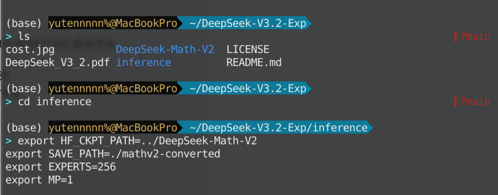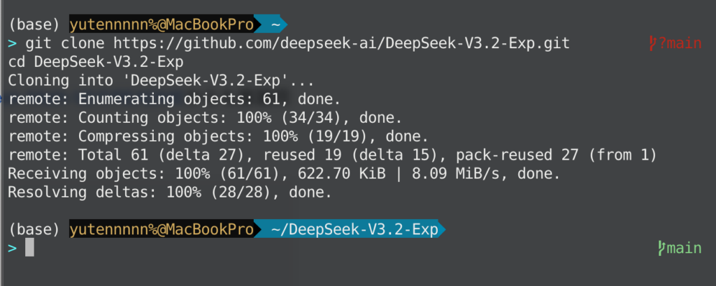 まず最初に、GitHubのDeepSeek-V3.2-Expリポジトリをクローンします。DeepSeek-Math-V2のREADMEからも推論用として参照されています。