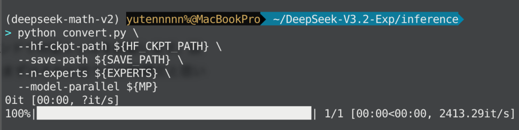 変換が終わったら、同じくDeepSeek-V3.2-ExpのREADME に記載されているコマンドで対話シェルを起動します。設定ファイルには公式例と同じ config_671B_v3.2.json が使われているので、まずはそれに従うのが無難だと思います。