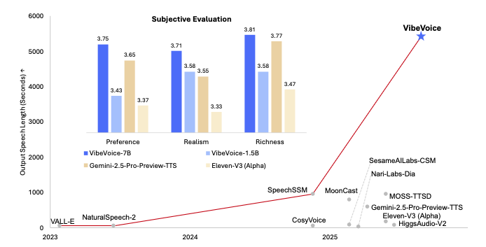 今回リリースされた「VibeVoice-Realtime-0.5B」はわずか0.5Bながらにリアルタイム処理が可能。長文読み上げにも対応できるよう、最大8kトークンという長いコンテキストウィンドウを処理できます。