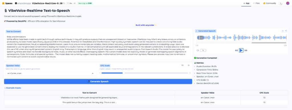 VibeVoice-Realtime-0.5Bは、最大8kトークンという長いコンテキストウィンドウを処理できます。これによりニュース記事や技術文書のような長文でも、文脈を保ちながら読み上げられる点が特徴。