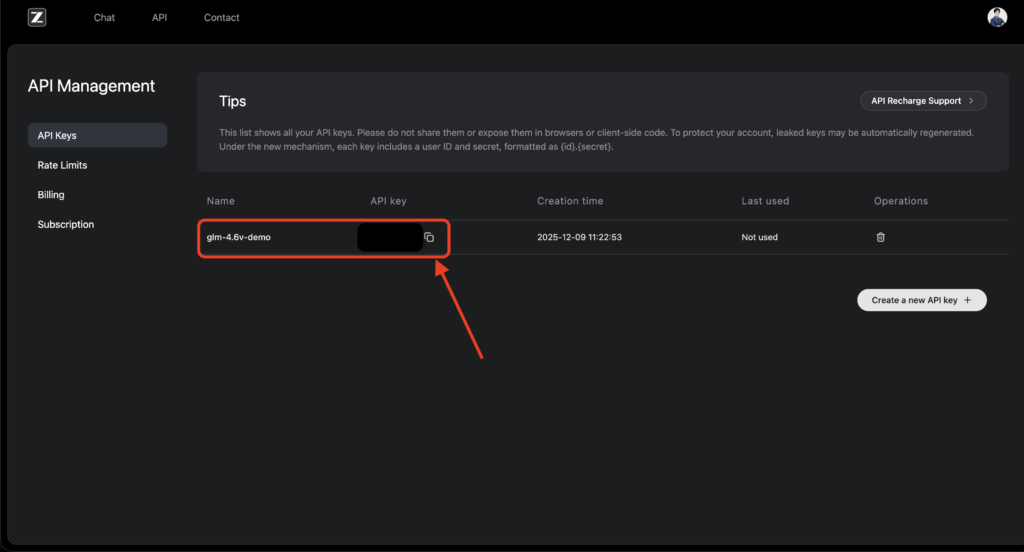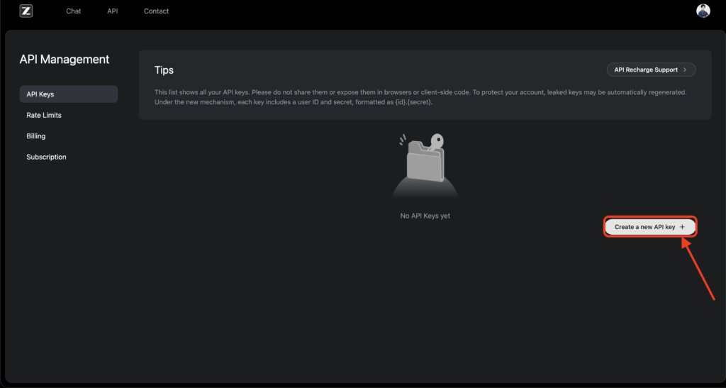 まず、Z.aiの開発者向けサイトでアカウント登録を行い、ダッシュボードからAPIキーを取得します。