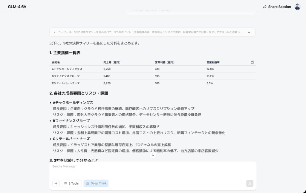 決算サマリーのダミー文章を3社分用意して、長文ドキュメントの比較分析をしてもらいます。