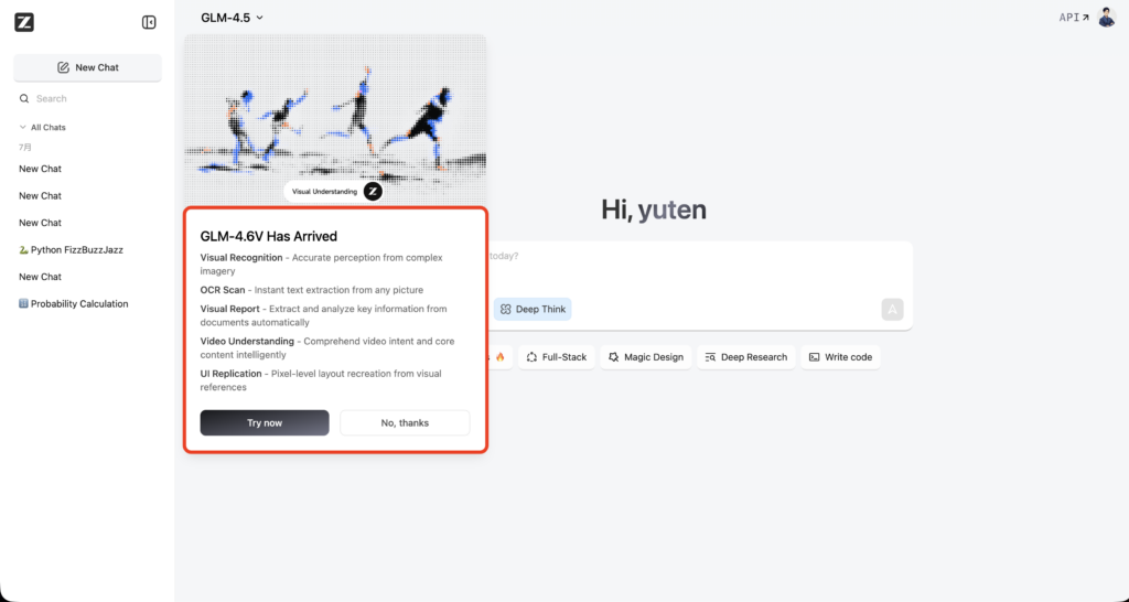 ここでは実際にGLM-4.6Vを、Z.ai公式チャットページで試してみます。