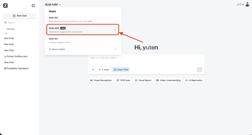 ブラウザで公式サイトのチャットページにアクセスし、モデル選択メニューから「GLM-4.6V」を選ぶだけで利用することができます。