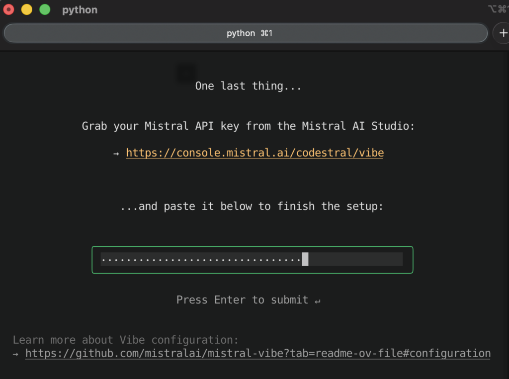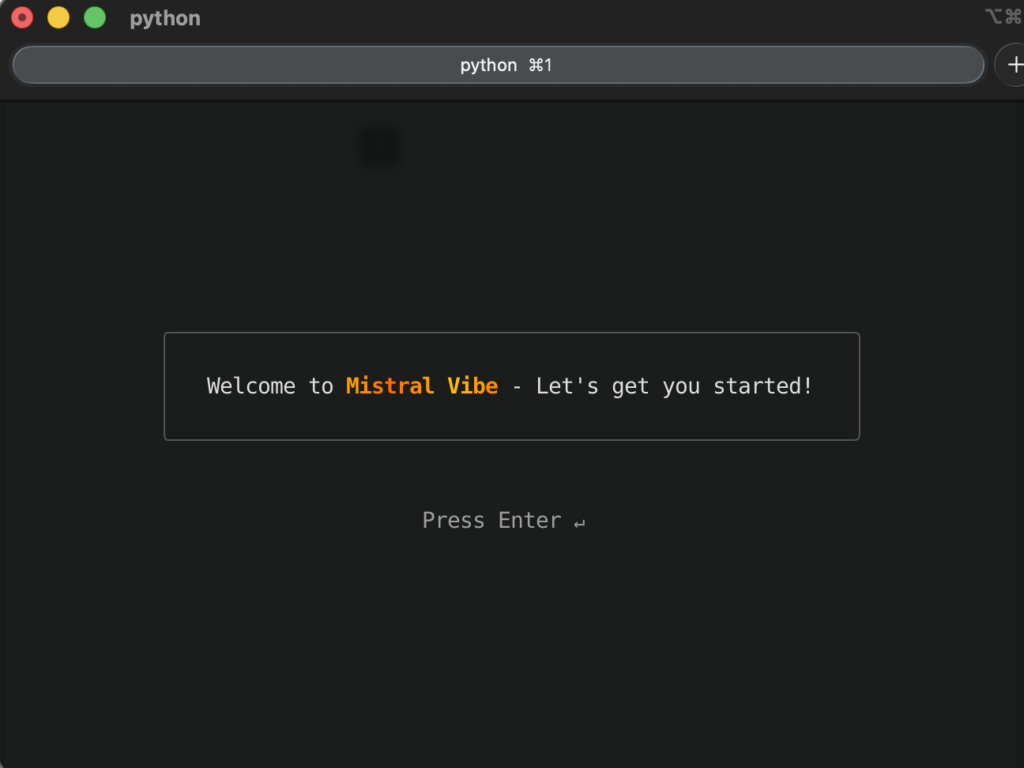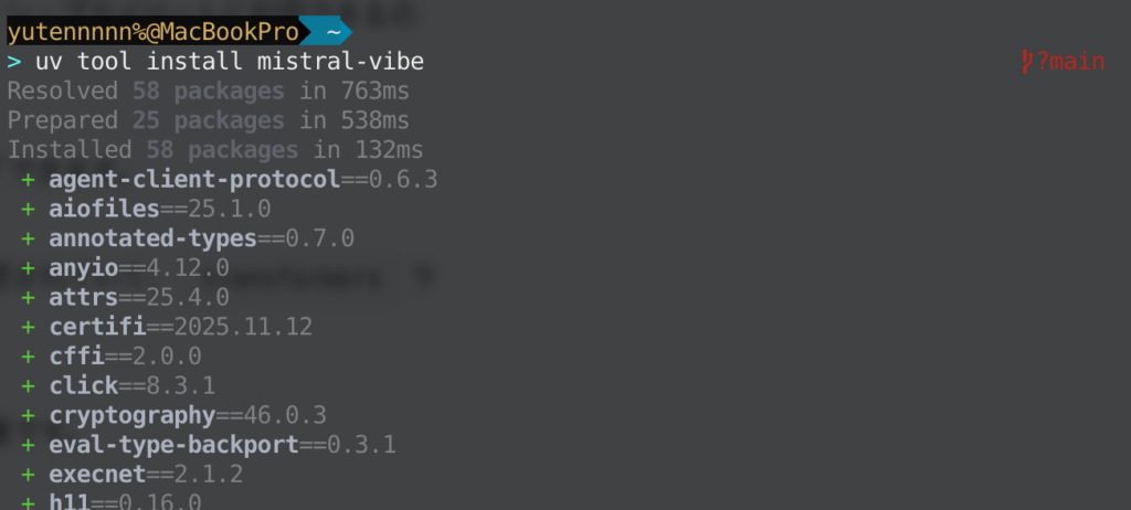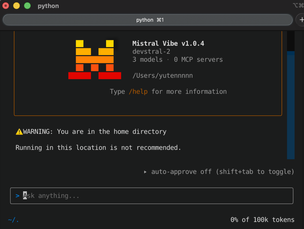 インストールが完了したら、mistral-vibeのパスを通して、vibe コマンドで起動するだけです。