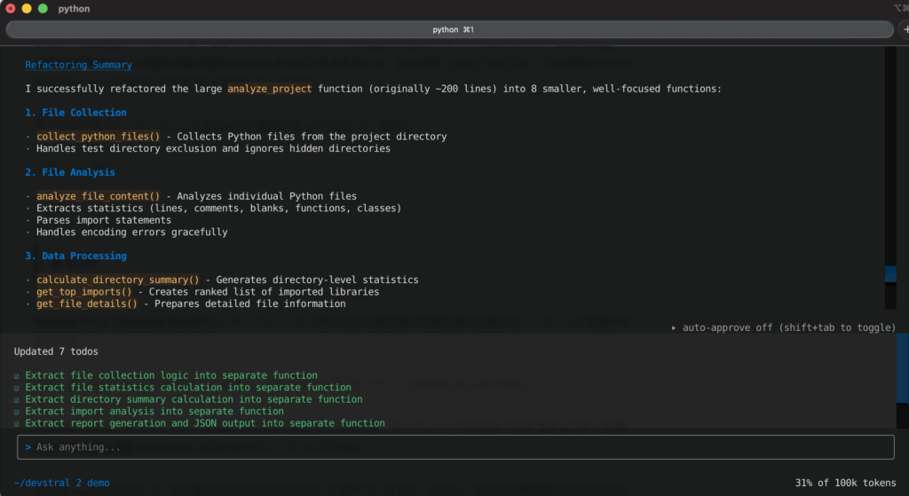 それでは実際にDevstral 2を使ってみましょう。せっかくなので、同時リリースされたVibe CLIを使って、ローカルにあるサンプルのコードプロジェクトに対して、リファクタリングをかけていくケースで実践してみます。