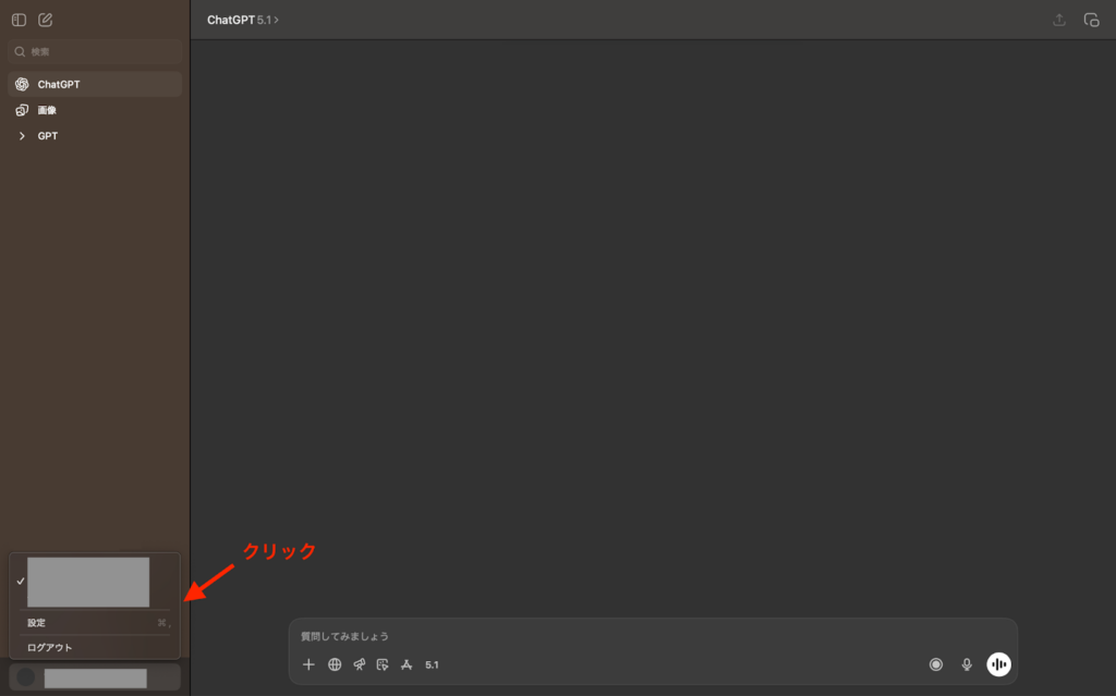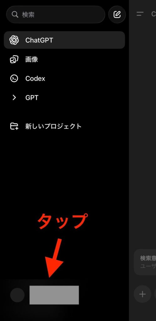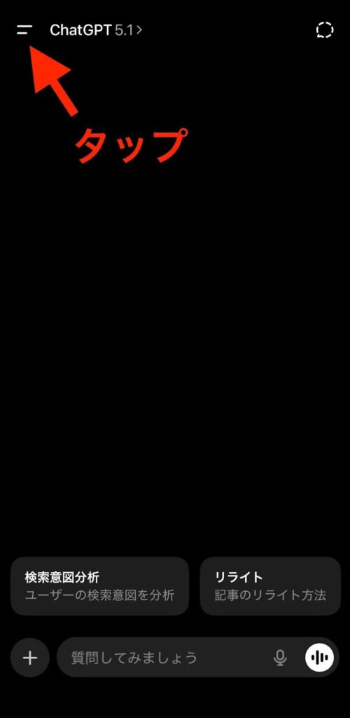 スマートフォンからChatGPTのアプリを開き画面左上のナビゲーションバーをタップ