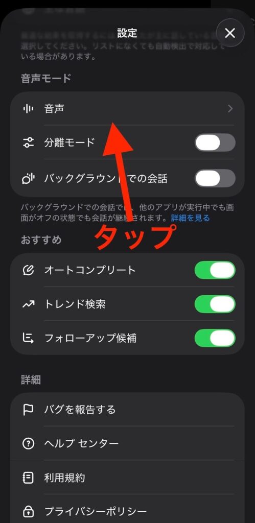 タップすると設定画面が表示されるため、音声モードという項目の「音声」をタップします。