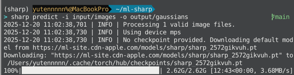続いて、推論を実行します。これで出力先に3D Gaussian Splats(.ply)が生成される流れになります。