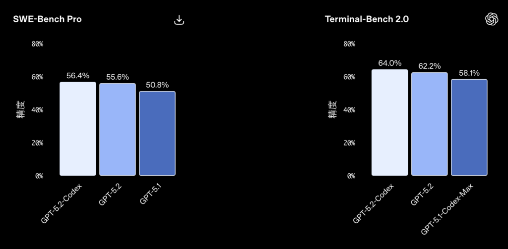 GPT-5.2-Codexは、Codexでのエージェント活用型コーディング向けに最適化されたバージョンとして、長期的な作業を支えるコンテキスト圧縮の強化に加えて、大規模なリファクタリングや移行といったコード変更でも性能が向上しています。