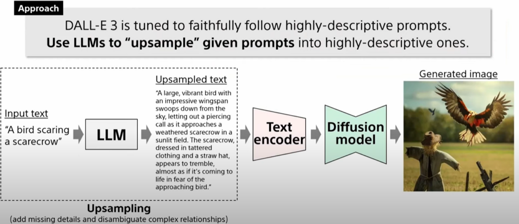 - 他のモデルの技術の応用:Soraは、DALL·E 3からのキャプション再生成技術を応用し、トレーニングセット内のすべての動画のテキストキャプションを生成します。また、GPTをGPTを活用して短いユーザープロンプトを長い詳細なキャプションに変換します。