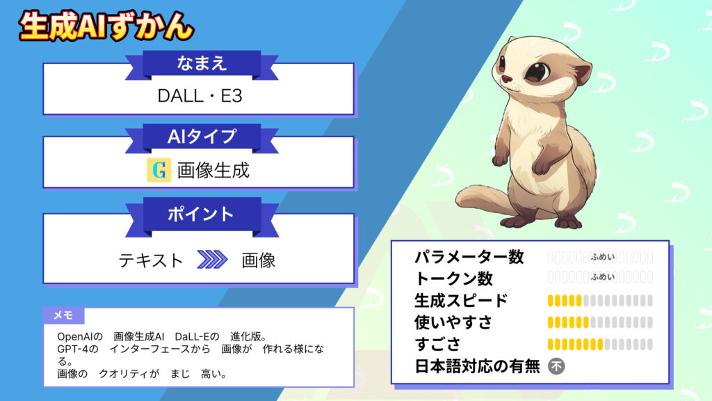 2023年9月21日にOpenAI社から発表された最新の画像生成AIで、ChatGPTを使って画像を生成することができるんです!従来のものから大幅に性能が向上しており、プロンプトのニュアンスを理解して入力に忠実な画像を生成してくれます。