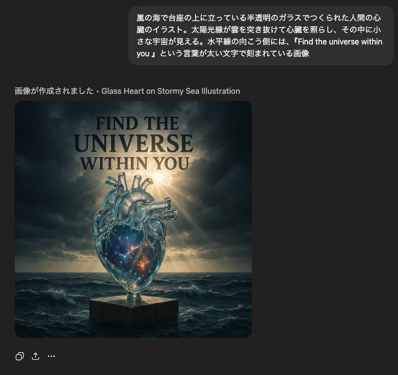 嵐の海で台座の上に立っている半透明のガラスでつくられた人間の心臓のイラスト。太陽光線が雲を突き抜けて心臓を照らし、その中に小さな宇宙が見える。水平線の向こう側には、『Find the universe within you 』という言葉が太い文字で刻まれている