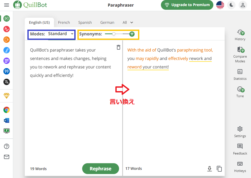 | Standard Mode | 原文の意味を保ちながらテキストの言い換えを行うバランスの取れたモード |