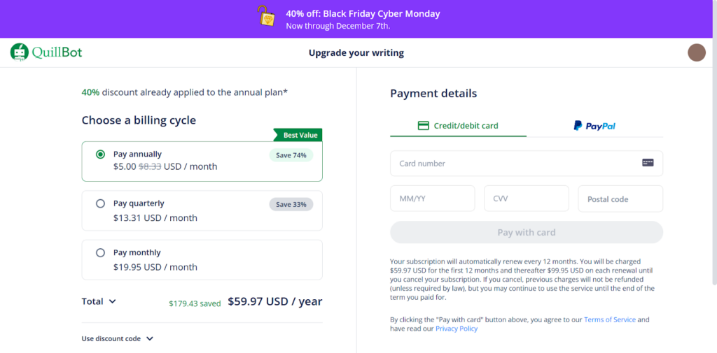 画像に表示されている「$5.00/月(年間契約)」は、ブラックフライデーの期間限定セールが適用された価格です。通常価格は $8.33/月で、契約更新時にはこの通常料金が適用されます。もしセール期間中であれば、大幅な割引で加入することが可能です。