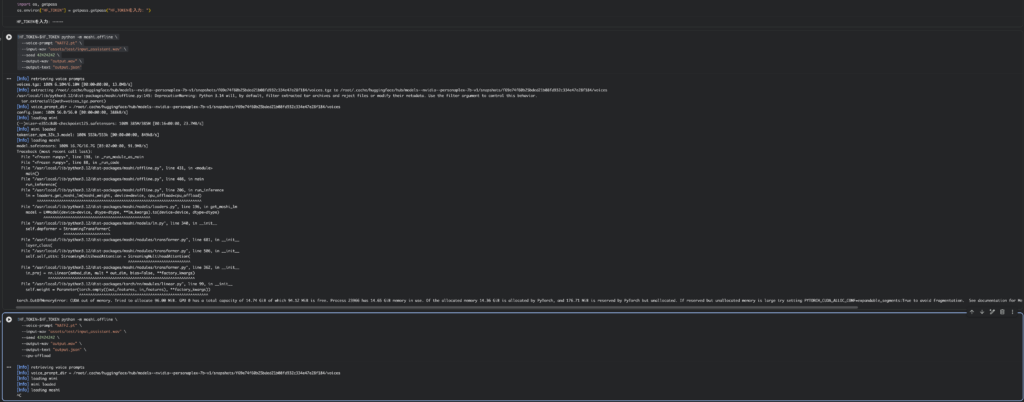 os.environ["HF_TOKEN"] = getpass.getpass("HF_TOKENを入力: ")以上で準備が完了しました。公式READMEに記載されているコマンドを実行します。