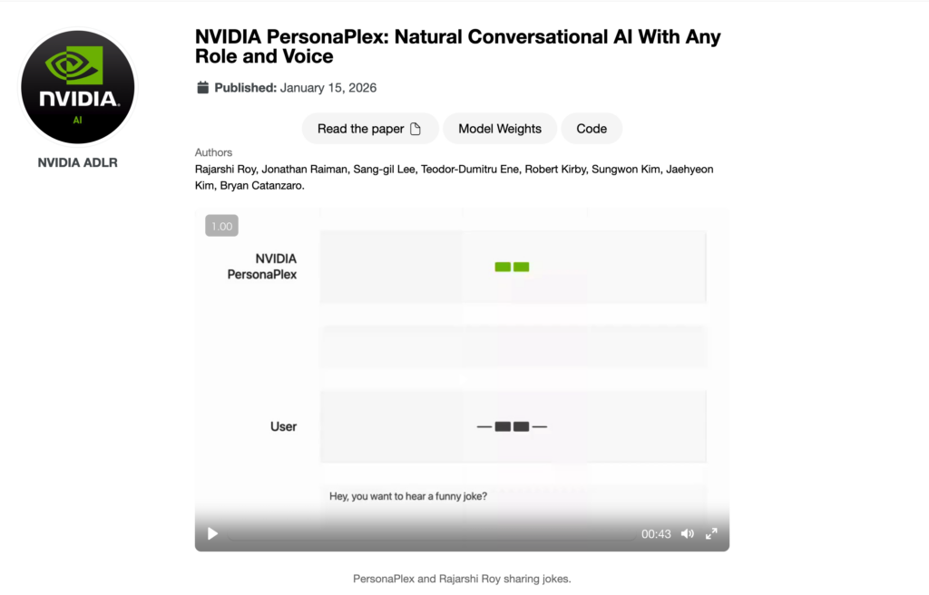 PersonaPlex-7Bは、リアルタイムの音声対音声で会話できるフルデュプレックス型の会話モデル。