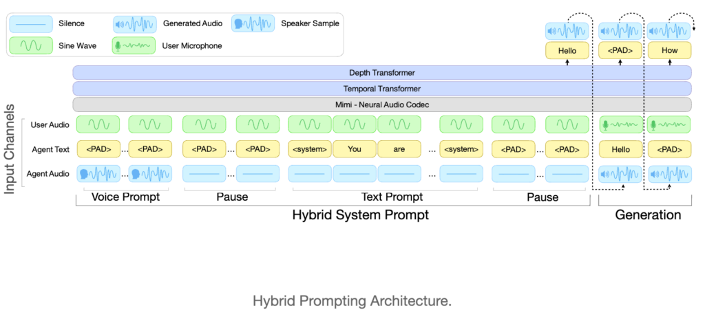 PersonaPlex-7Bは会話開始前に「voice prompt」と「text prompt」の2つで条件付けを行う点がポイントです。アーキテクチャはTransformerで、Moshi系のネットワーク構成をベースにしています。