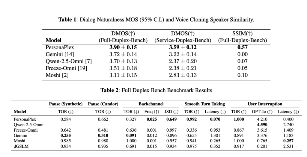 画像上段の表はより自然な会話かどうかを評価している指標になりますが、PersonaPlex-7Bは人が聞いても自然に会話していると最も感じられたモデルです。