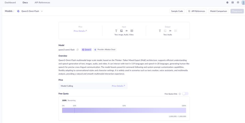 Qwen3-Omni-FlashはAPIで提供されており、リージョンによって無料クォータの有無が異なります。