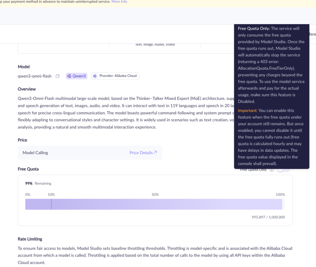 Qwen3-Omni-Flashの料金・無料クォータ