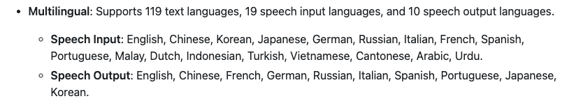 | アーキテクチャ | Mixture-of-Experts採用の「Thinker–Talker」設計。推論と音声生成を分離し、低レイテンシかつ高精度な応答を実現。 |