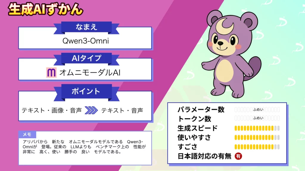 今回リリースされた「Qwen3-Omni」は音声・画像・動画に対応しており、入力だけでなく自然な音声をリアルタイムに出力できます!