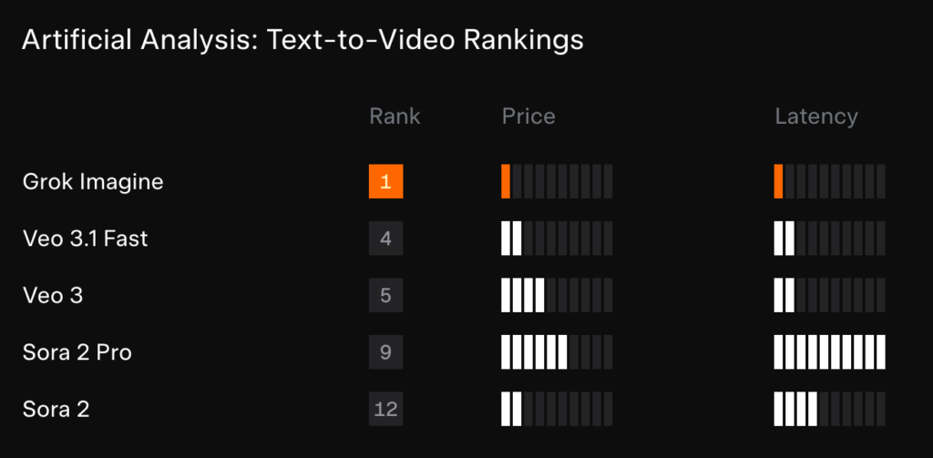 パフォーマンス面では、Artificial AnalysisのText-to-VideoランキングでGrok Imagineが1位になっています。