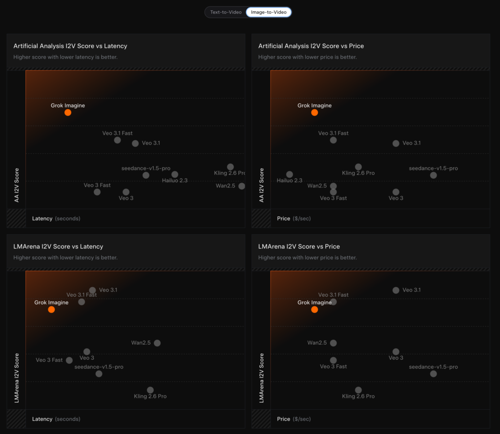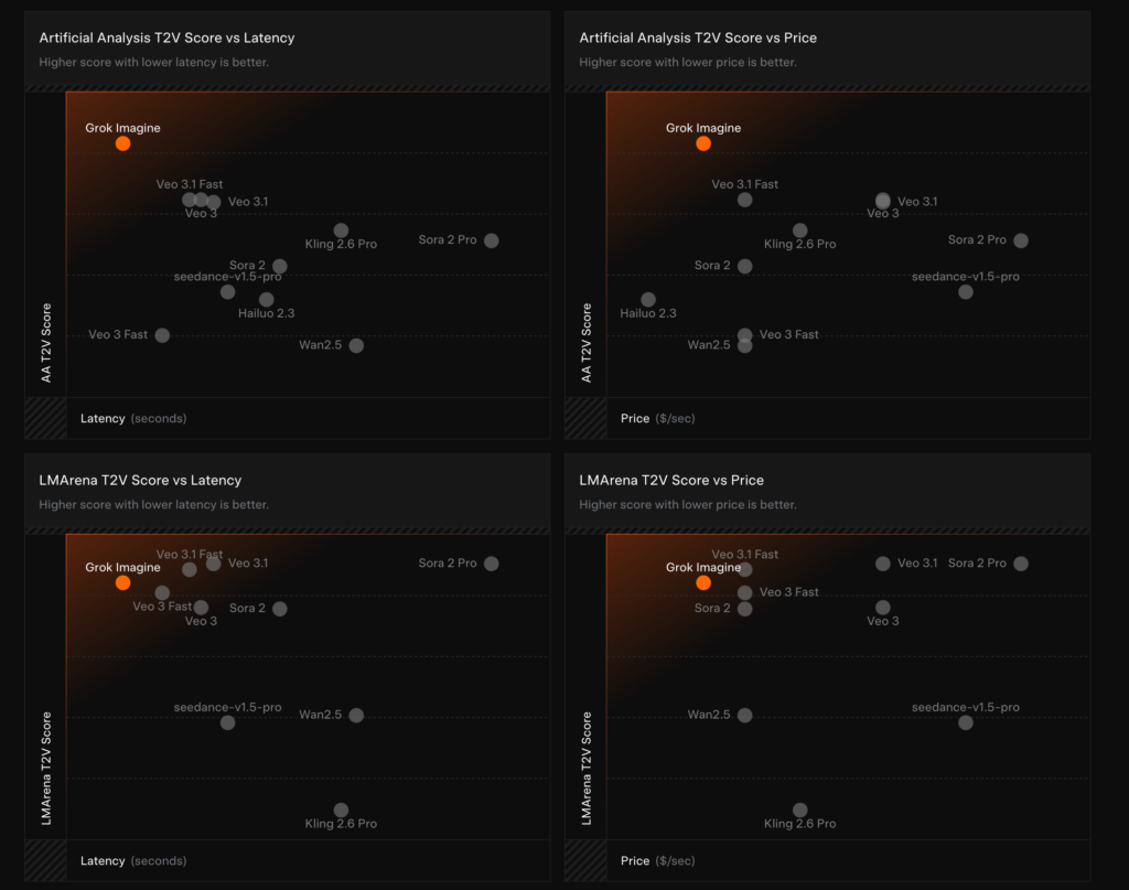 Grok Imagine APIの最大の特徴は品質・コスト・レイテンシのバランスを重視していること。Text-to-Videoの評価では、品質スコアと応答速度を同時に示す形でランキング上位に位置付けられています。