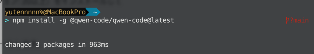 続いて、ターミナルで以下のコマンドを実行し、Qwen Codeをグローバルインストールします。