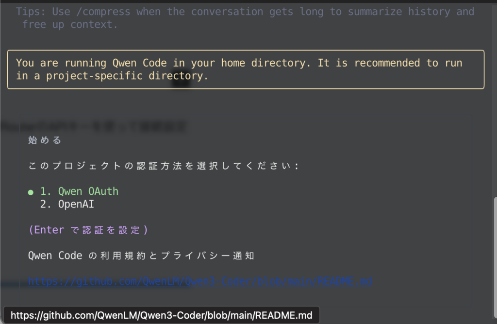 インストールできたら、qwenと入力してCLIを起動します。初回起動時に認証方法を聞かれます。