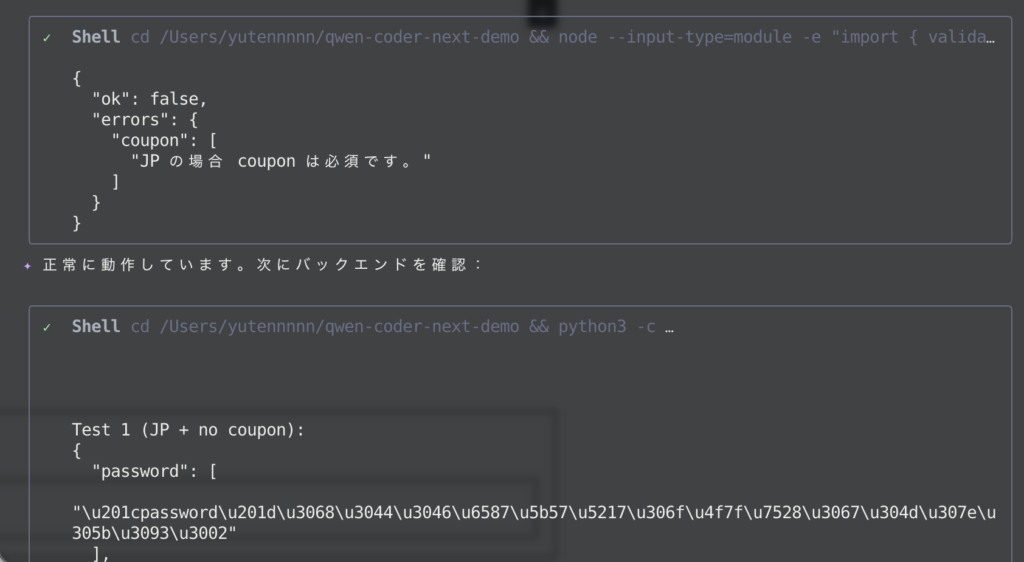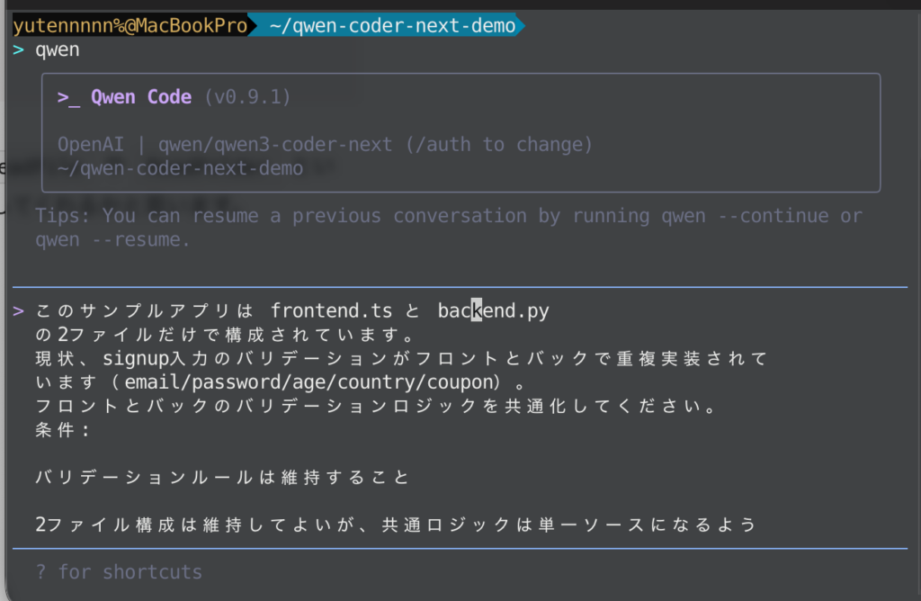 それでは、実際にQwen3-Coder-NextをQwen Code上で使ってみましょう。