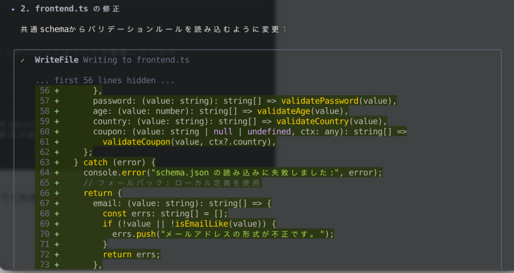 続いて、共通スキーマを新規作成しながら、既存ファイルの改修をしてくれました。