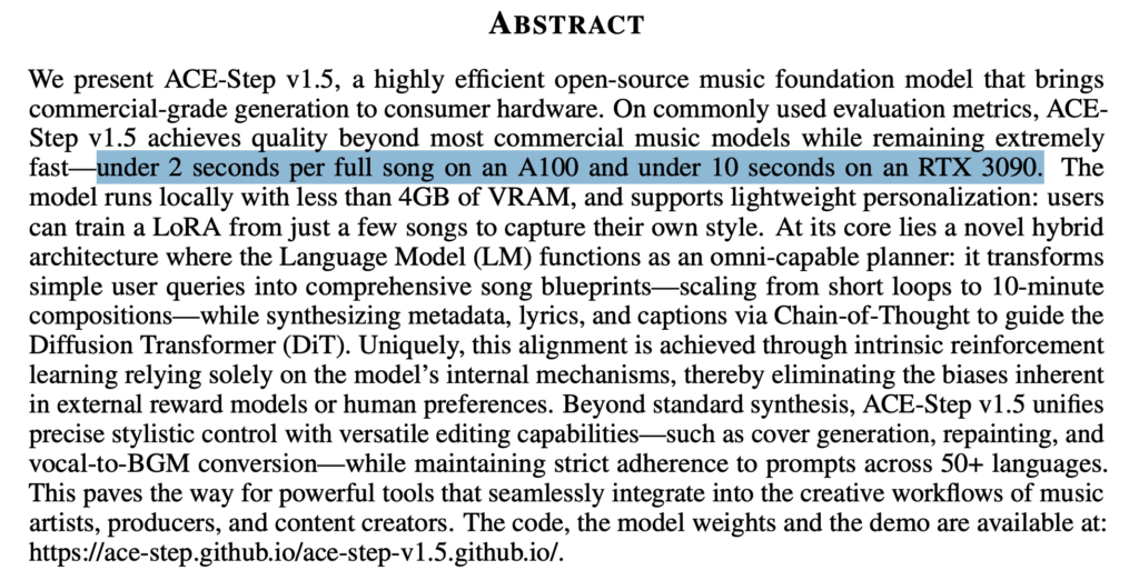 生成速度はA100でフルソングが2秒未満、RTX 3090で10秒未満で生成でき、必要VRAMは4GB未満とされており、ハイエンド環境に限定されません。