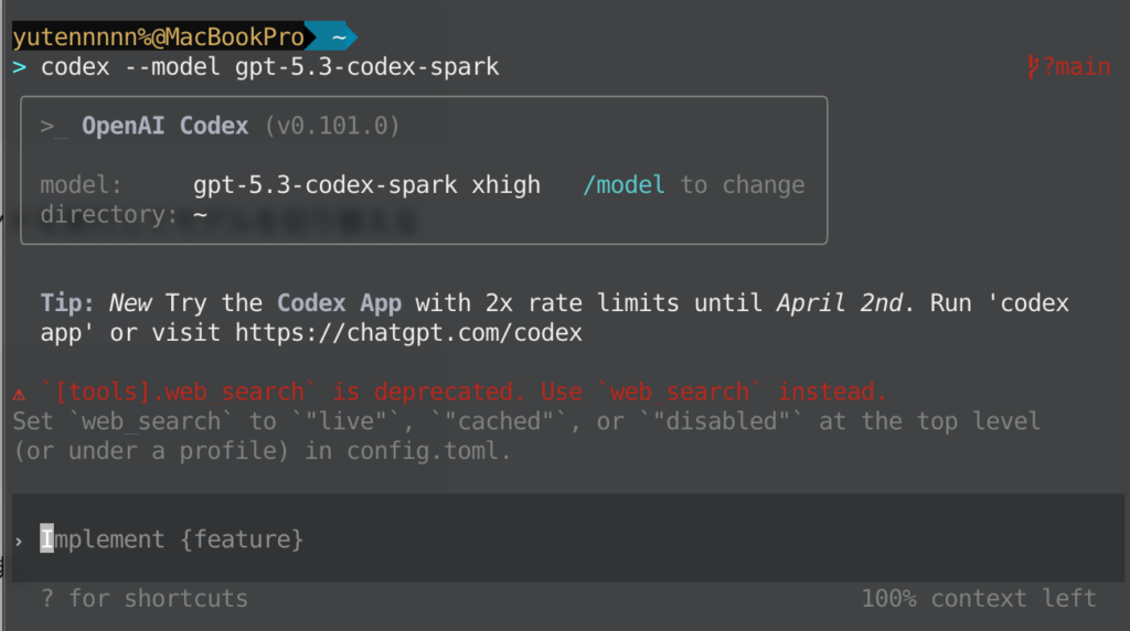 新しいスレッドを開始する際に --model オプションでCodex-Sparkを指定します。