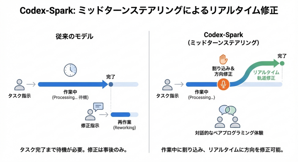 Codex-Sparkのミッドターンステアリング機能により、モデルの作業中にリアルタイムで割り込んで方向を修正できます。