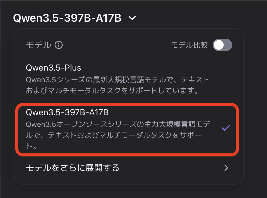 その後、チャット画面上部のモデル選択欄から「Qwen3.5-397B-A17B」を選択します。テキストだけでなく、画像や動画をアップロードして質問することも可能です。