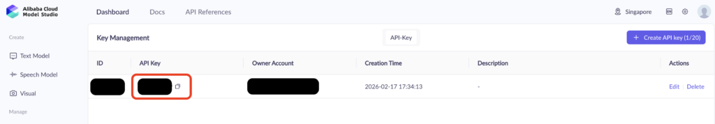 まずは、Alibaba Cloud Model Studiohttps://modelstudio.alibabacloud.com/) でアカウントを登録して、ダッシュボードページからAPIキーを生成します。