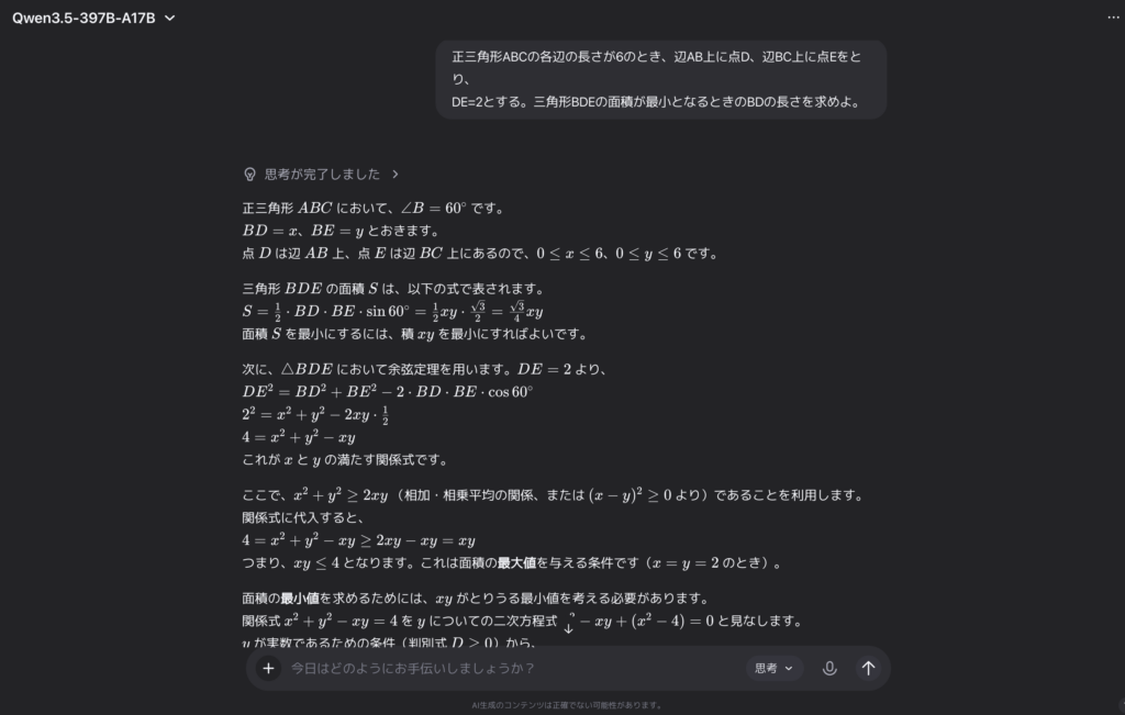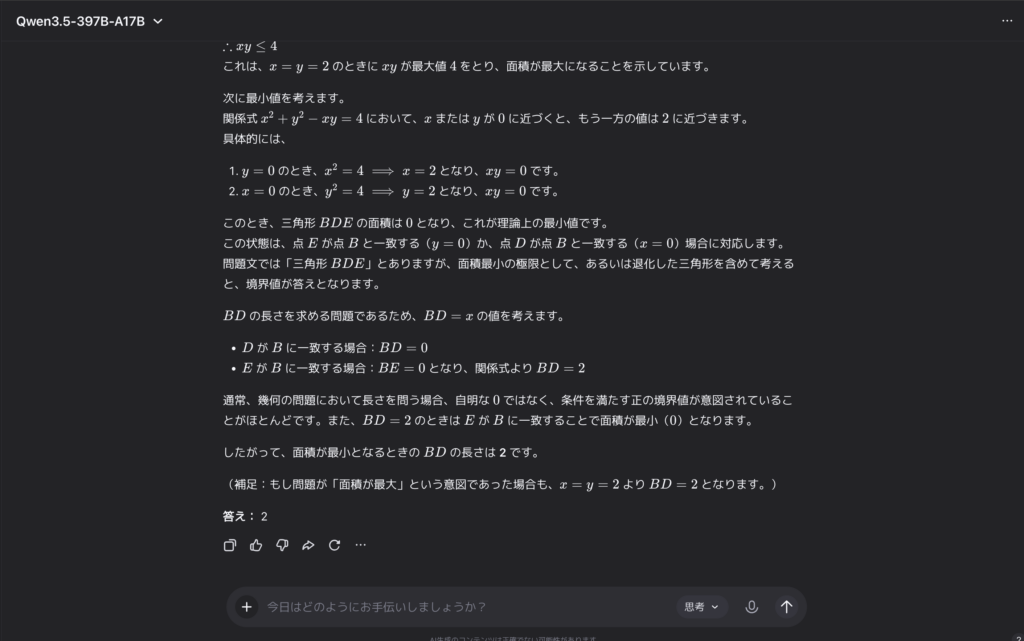 問題の意図として、「面積が正の最小値」を求めるのか「面積が最大」を求めるのかで解釈が分かれうる問題設定だったので、Qwen3.5が補足で両方のケースに触れているのは丁寧な対応だと感じました。