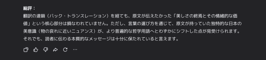 なんの問題もなく、一連の翻訳連鎖を経て、ほとんど意味を損なわずに日本語へ戻してくれました。自己評価も良い感じですね。