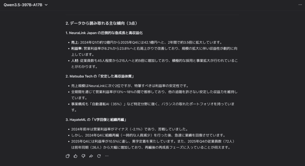 Qwen3.5-397B-A17Bの特徴である、100万トークンのコンテキスト長と高速デコード(従来比最大19倍)によって、数100ページの書類を一度に読み込んで分析できます。