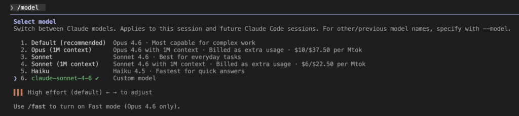 セッション中にモデルを切り替えたい場合は、チャット内で以下のコマンドを入力してSonnet 4.6を選択しましょう。
