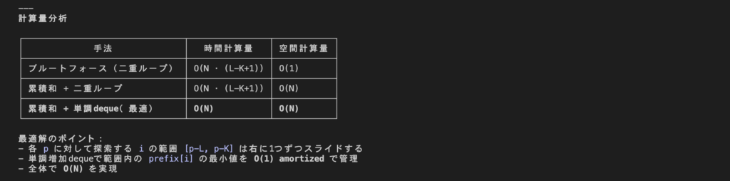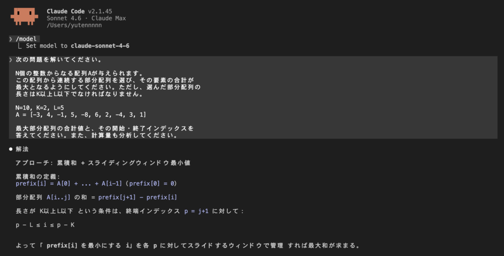 Adaptive Thinkingが自動的に深い推論モードに入り、スライディングウィンドウとプレフィックスサムを組み合わせたO(N)のアルゴリズムを導出してくれました。
