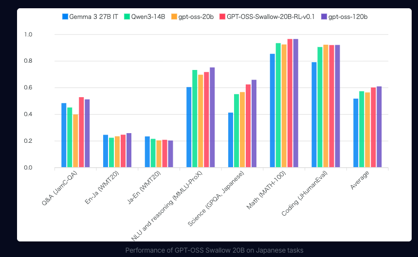 このアプローチにより、汎用性能と日本語性能の両立が狙われており、また、複数系列(GPT-OSS Swallow / Qwen3 Swallow)を展開することで、用途別に最適なモデルを選択することも可能です。